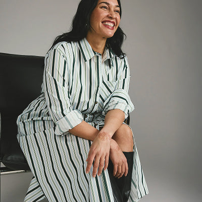 Odeon Stretch Poplin Shirtdress - Forest Green Multi Stripe Odeon Stretch Poplin Shirtdress - Forest Green Multi Stripe