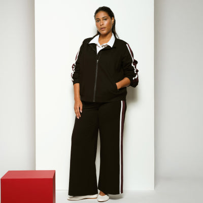 Stephanie Wide Leg Stripe Ponte Pants 30 Inch - Black Cherry with Green/Ultramarine Piping Stephanie Wide Leg Stripe Ponte Pants 30 Inch - Black Cherry with Green/Ultramarine Piping