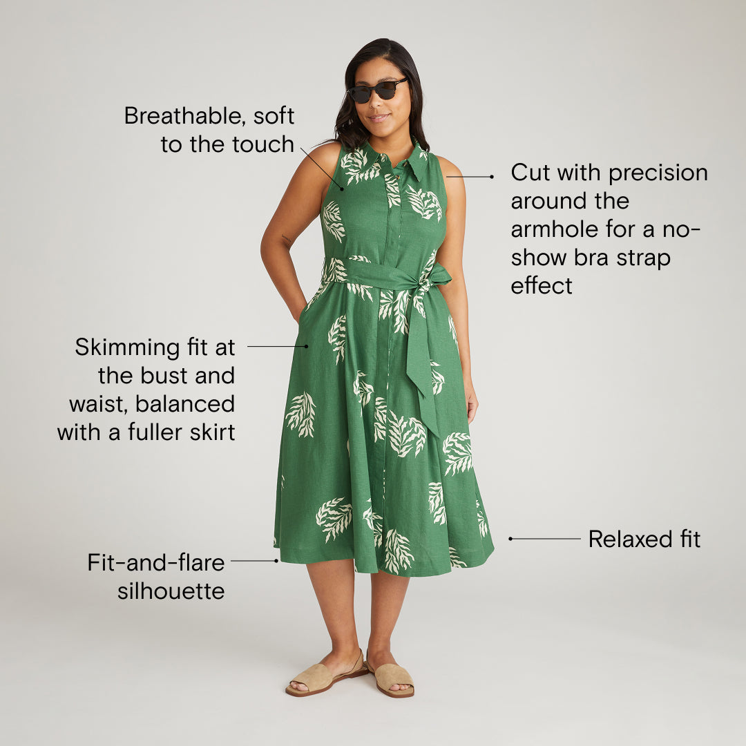 Meet Adelaide, the expertly tailored and uber-comfortable new shirtdress in our covetable stretch linen. Breathable, soft to the touch, and easy to care for, this fabric also presents a polished look in our button-down dress, making it work-friendly too. The skimming fit at the bust and waist is balanced with a fuller skirt, creating a very-now silhouette—the fit-and-flare. Cut with precision around the armhole, it pairs perfectly with a cross-back bra for a no-show strap effect.
