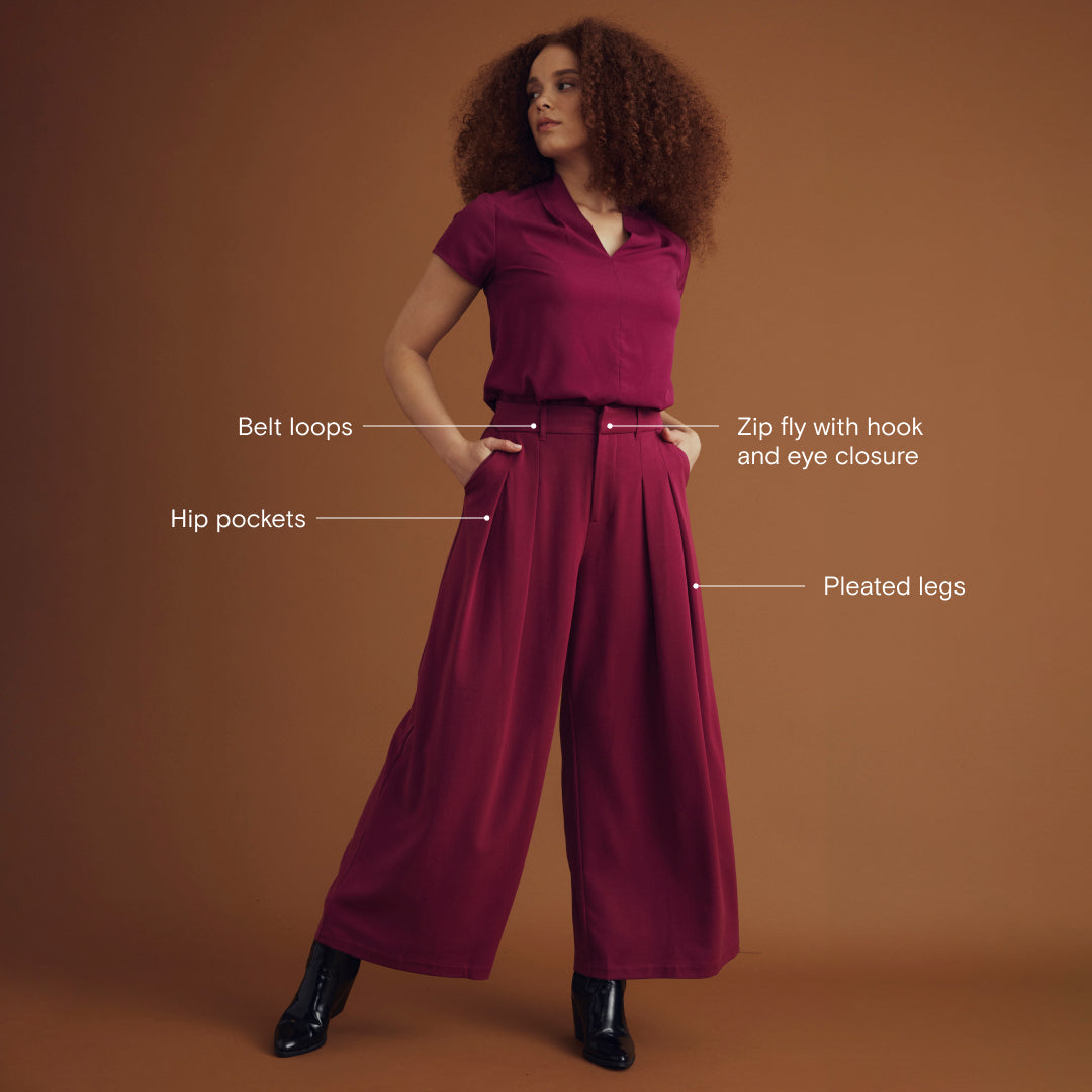 Elevate your suiting game with the All Day Wide Leg Pants, the perfect blend of sharp tailoring and everyday comfort. These pants feature stitched down front knife pleats for a sleek silhouette, back darts to enhance the fit, and front slash pockets for practicality. An encased elastic waistband at the back ensures a gap-free fit, while belt loops offer styling versatility. Made from our comfortable, sustainable All Day suiting fabric, this lightweight wide-leg style delivers a powerful yet polished look, pairing effortlessly with any blazer in the collection.