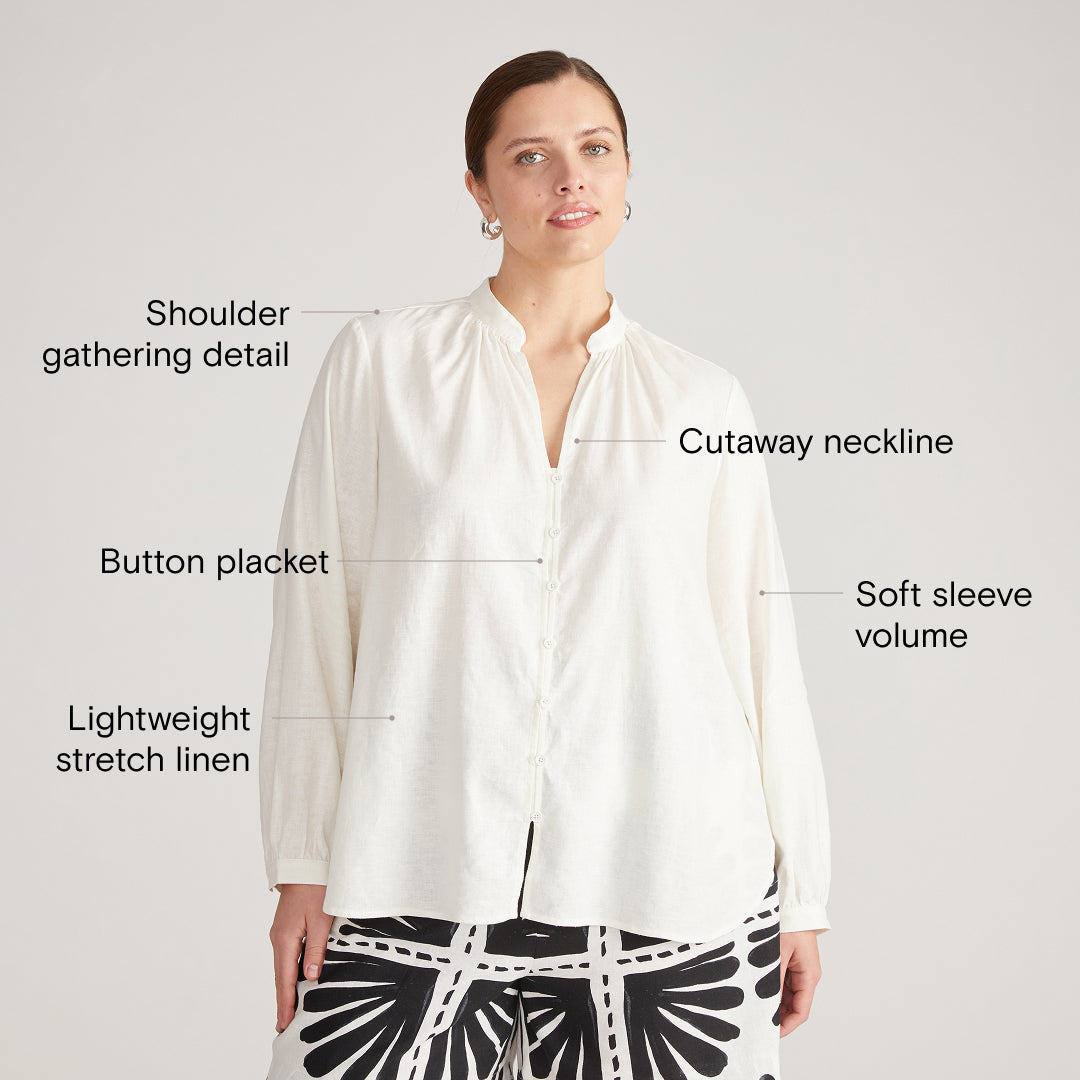 Learn MoreCrafted from our lightweight stretch linen, the Avalon Top adds a touch of romance to understated elegance. A soft bloom of volume in the sleeves and gentle gathering at the shoulders create a relaxed fit, while the cutaway neckline and button detailing make this one of the easiest tops to fall in love with. Pair it with our matching linen shorts or pants.
