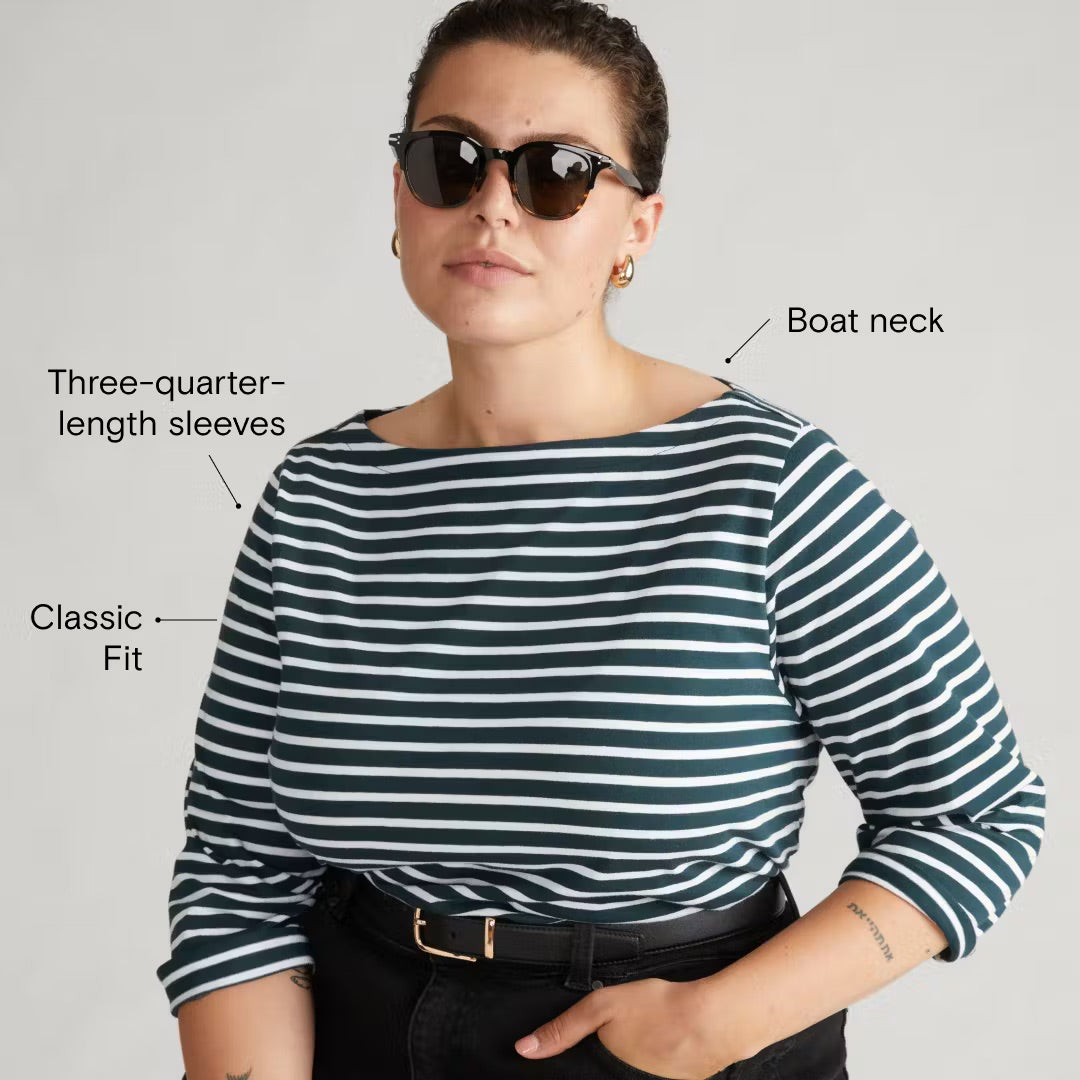 Learn MoreA favorite silhouette. A brand new fabric. Meet the Belle tee in a yarn-dyed, compact-knit jersey that was developed by US. It feels soft yet substantial, and it features classic Breton stripes throughout. Additional details include a refined boat neck and three-quarter-length sleeves. This is the summer staple that will also work between seasons. A must-have.