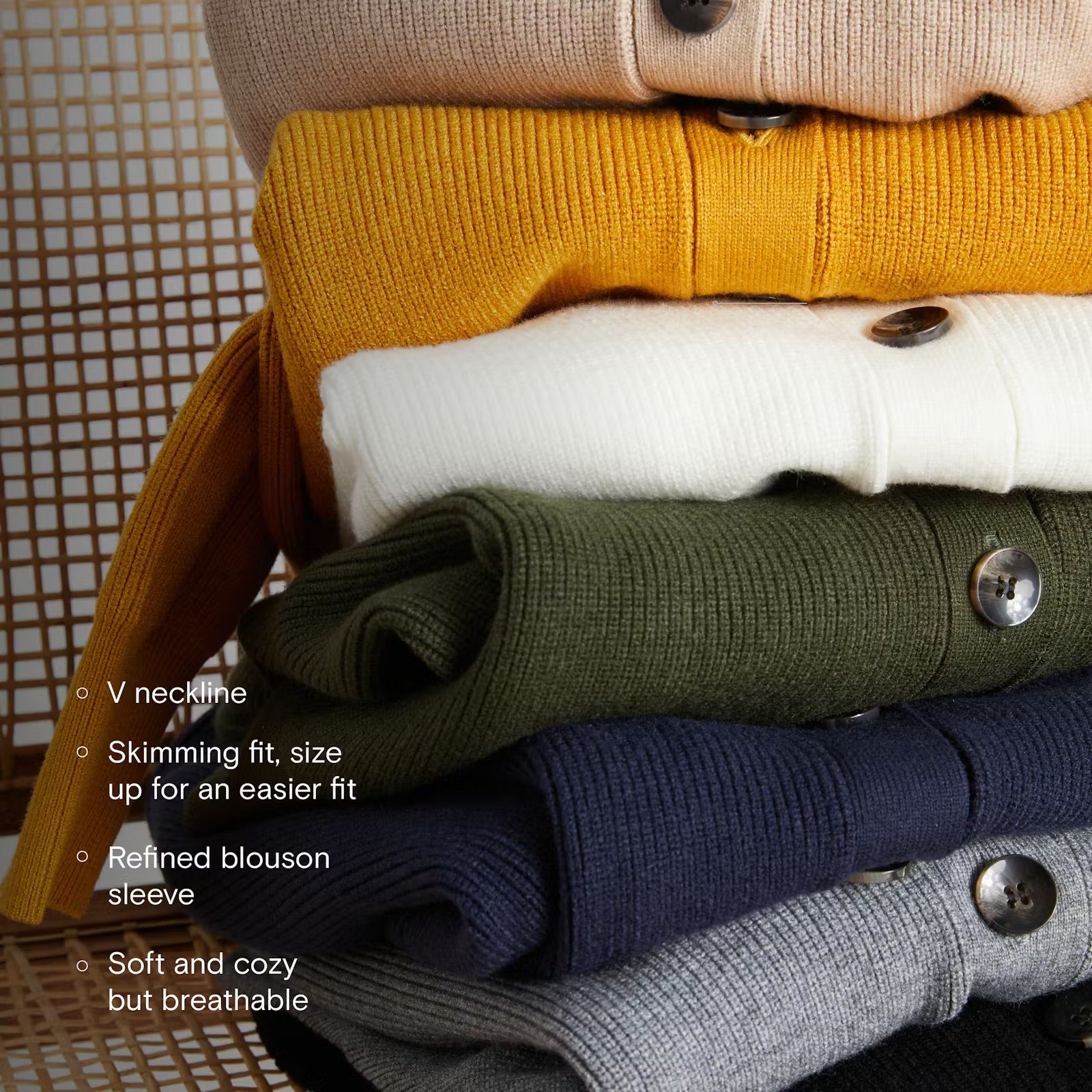 So soft, not scratchy. This is your ultra-cozy alternative to a classic wool sweater. It’s so luxe and feels like cashmere, but it’s pill-resistant, and you can wash it yourself! We wanted to make a neat, tailored cardigan without losing warmth or loftiness. The elevated yarn is just chunky enough, the silhouette is clean, and the blouson sleeve is refined. This is the sweater to wear with baggy or wide-leg jeans. It won't look too bulky and will create the best silhouette.