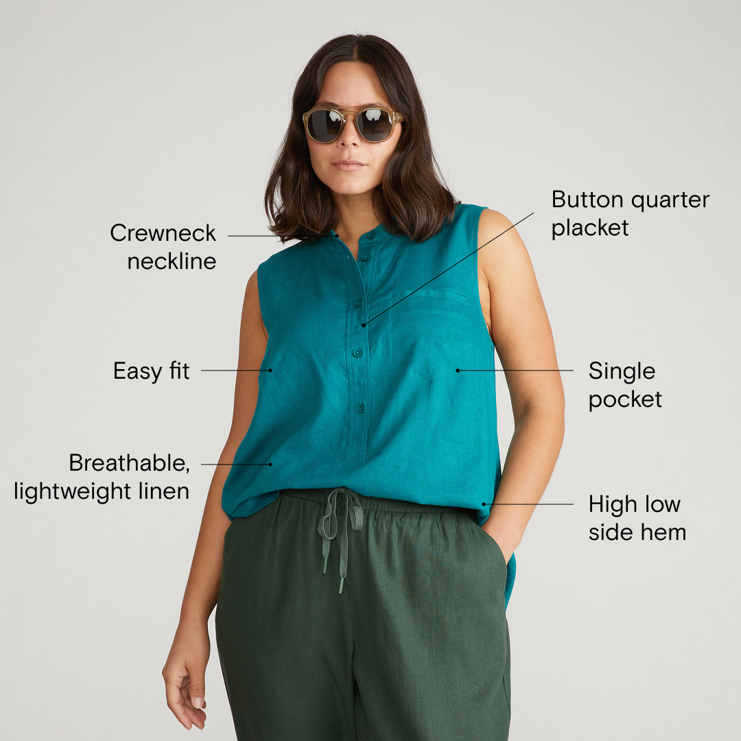 The simplicity of our sleeveless linen tunic is the key to its versatility. With an easy fit, this style floats over the body, and its breathable, lightweight linen makes it a perfect choice for warmer days ahead. Layer it with other relaxed silhouettes for an effortless summer vibe.