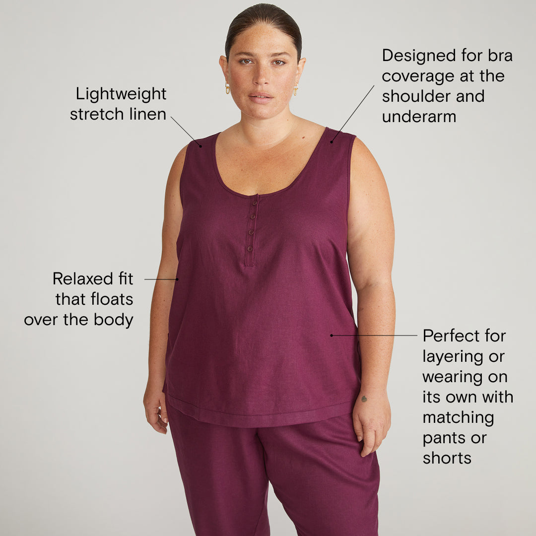 The Henley Tank in our lightweight stretch linen is simplicity at its finest. Designed for bra coverage at the shoulder and underarm while offering a relaxed fit that floats over the body, its breathable, incredibly soft fabric makes dressing for warmer days a breeze. Perfect for layering or wearing on its own with matching pants or shorts.