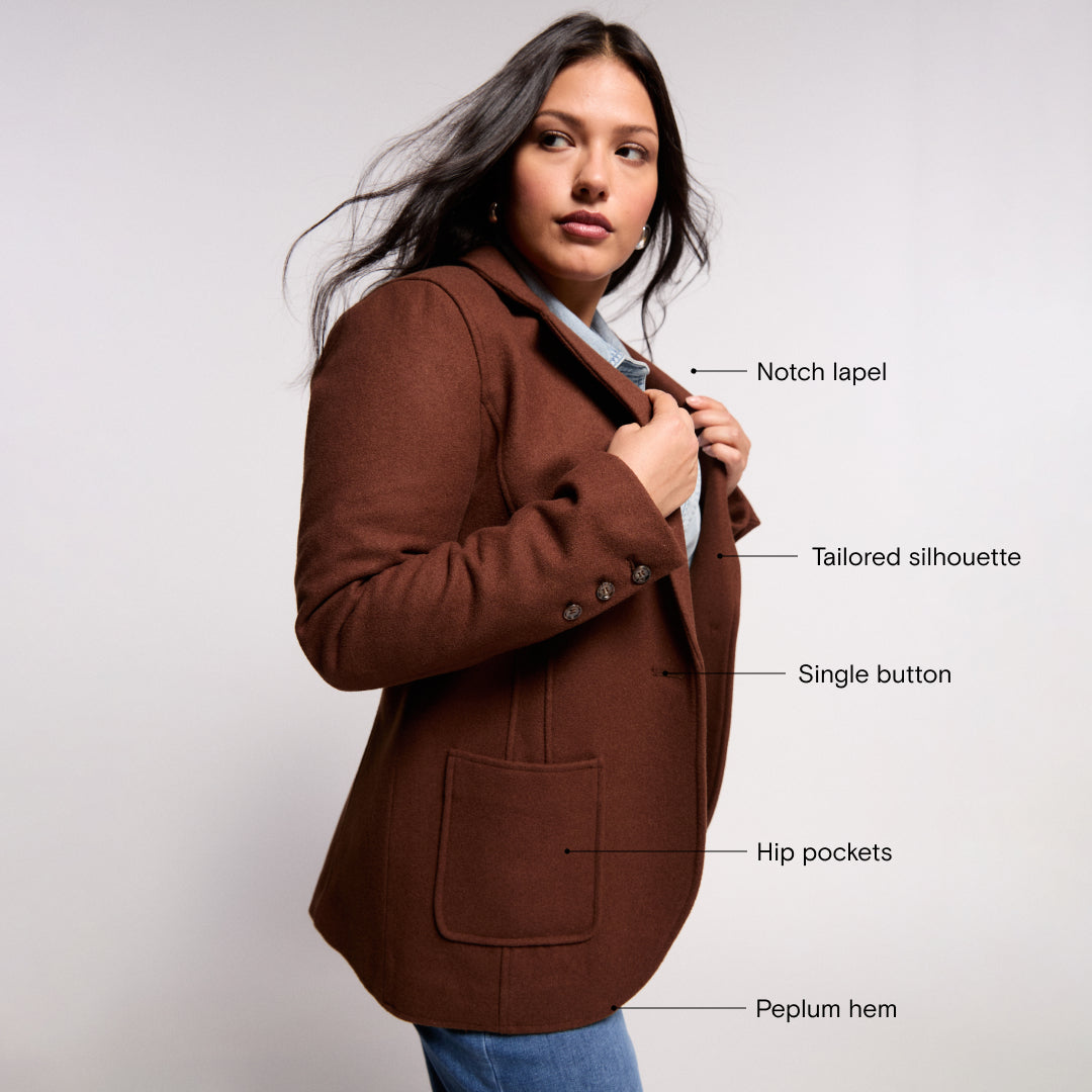 Meet your perfect city coat. Tailored and chic, it’s made from our luxe wool blend. Key details include the single button closure, patch pockets at the hips, and a subtle peplum-style hem. We love wearing this style with a dressier outfit but it also looks cute with jeans.