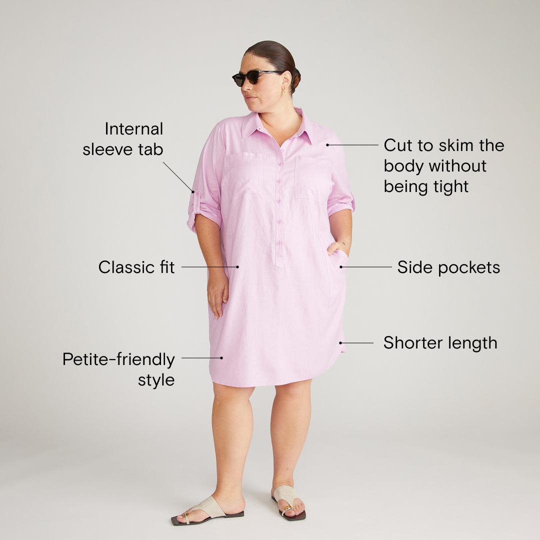 Learn MoreBased on our Rubicon Shirtdress, our Pocket Linen version offers a more playful take for spring. Cut to skim the body without being tight, this style is petite-friendly thanks to its shorter length and classic fit at the shoulders and bust. The sleeve is finished with an internal tab to keep rolled-up sleeves in place.