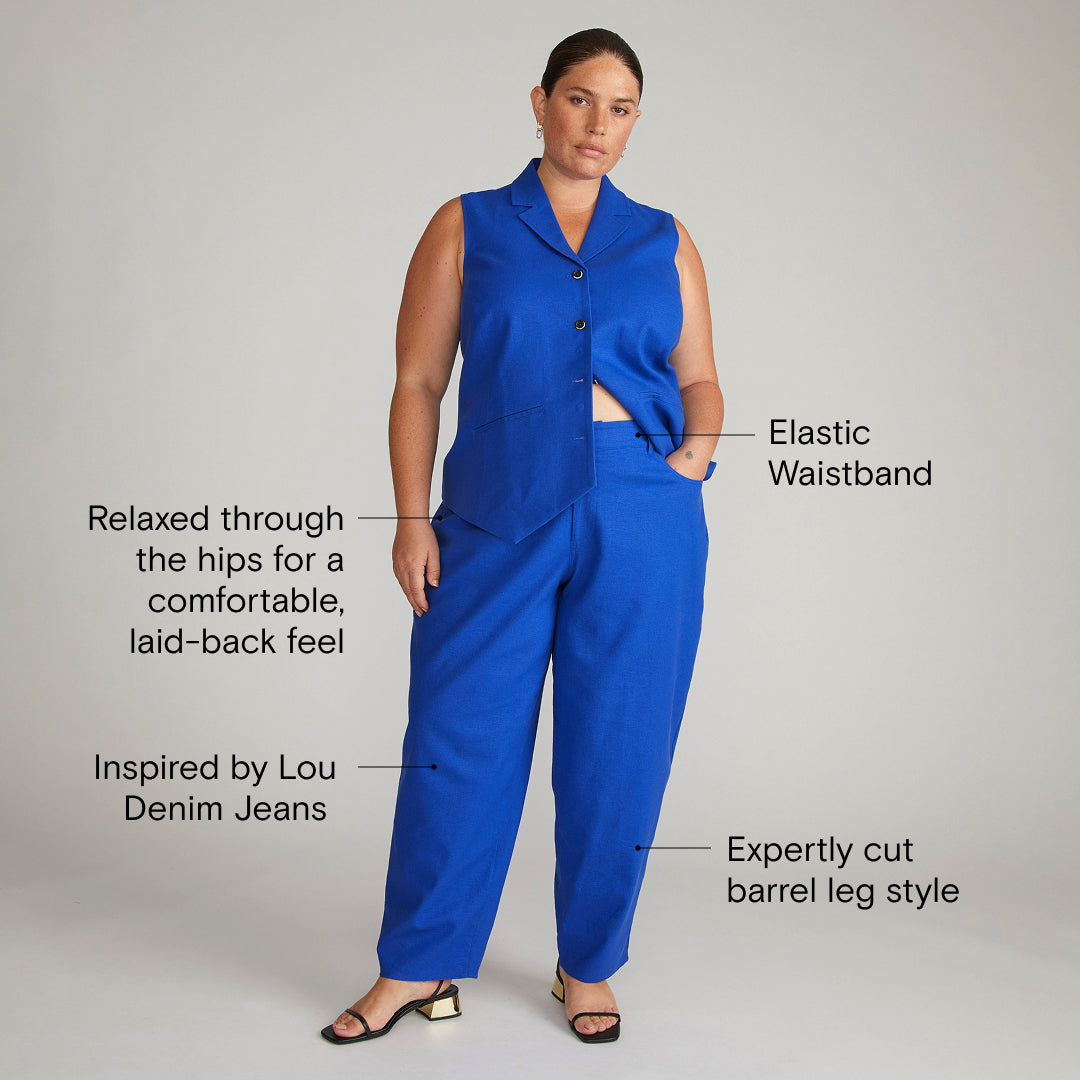 Inspired by our Lou Denim Jeans, this expertly cut barrel leg style are reimagined in breathable stretch linen. Fit on both plus and straight size to deliver a true barrel leg look, they are cut with an easy fit around the hip, and encased elastic at the back waistband for extra comfort and movement.