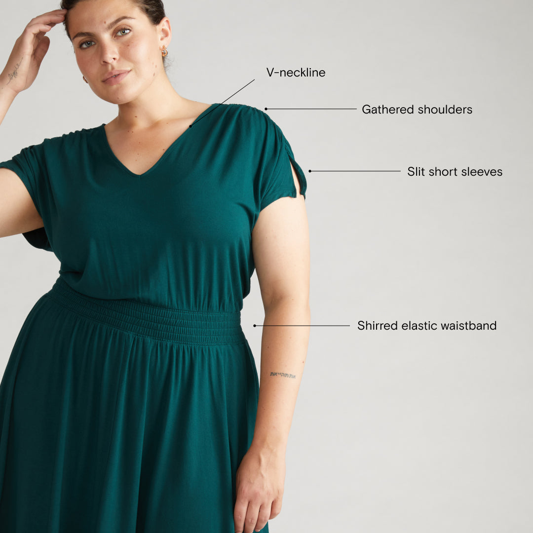 Meet the dress designed for date night. It’s a throw-on-and-go style in our soft and drapey liquid jersey. With a V-neckline, gathered shoulders, and a shirred waistband it’s simple but just detailed enough to draw onlookers in. Perfect for balmy evenings bouncing between comedy clubs and jazz bars, followed by a walk through the moonlit park.