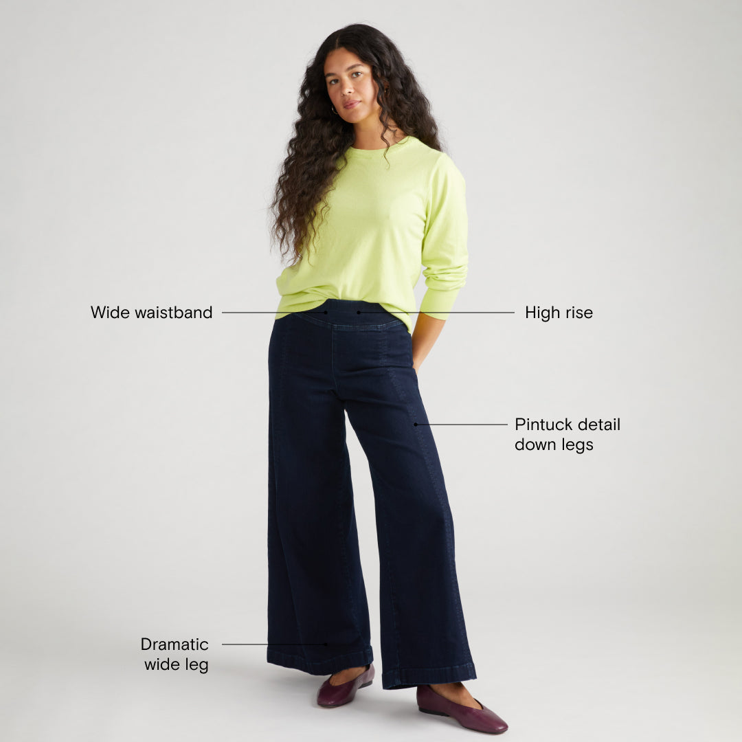 Learn MoreYou’ll be hopelessly devoted to these jeans. They feature a high rise and a dramatic wide leg. Plus, you can pull them on. The wide waistband is extra comfy and the pintuck detailing is so chic. Dance through the season in your new favorite denim.