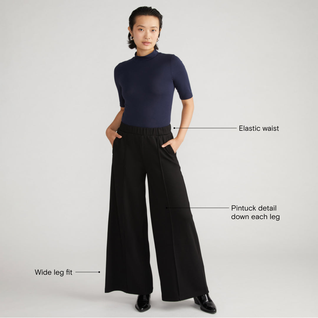 You’ll be everyone’s office crush in these cute pants. Made from our beloved Ponte fabric, they’re stretchy and soft with a wide leg. Pull them on easily thanks to the elastic waist. We love the pintuck detailing that adds a little extra something to your look.