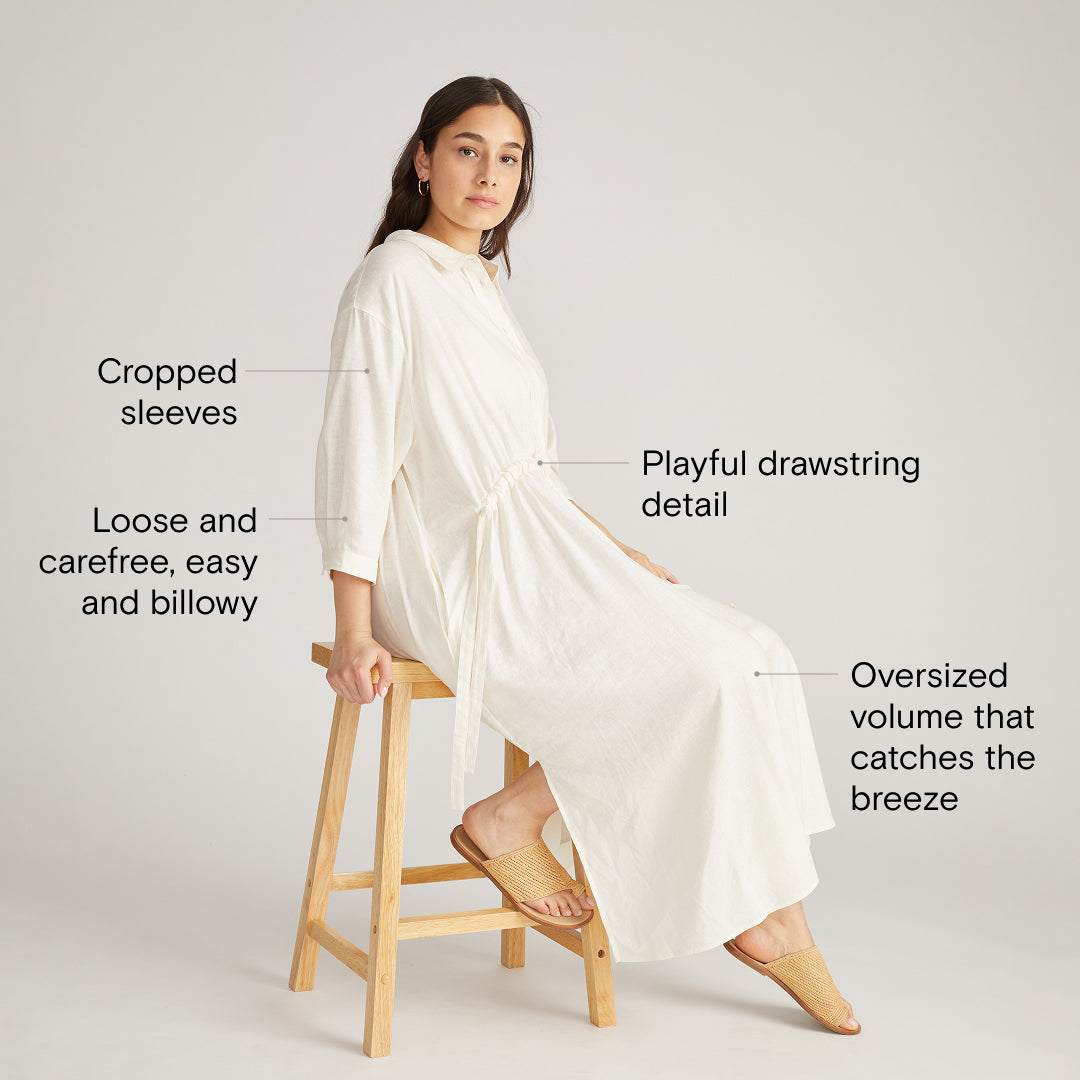 Loose and carefree, easy and billowy, our Paros Shirtdress captures the spirit of island hopping or sailing the Mediterranean. There’s a feeling of freedom this dress inspires—with its cropped sleeves and oversized volume that catches the breeze. A playful drawstring detail adds casual summer ease to this beautifully made shirtdress.
