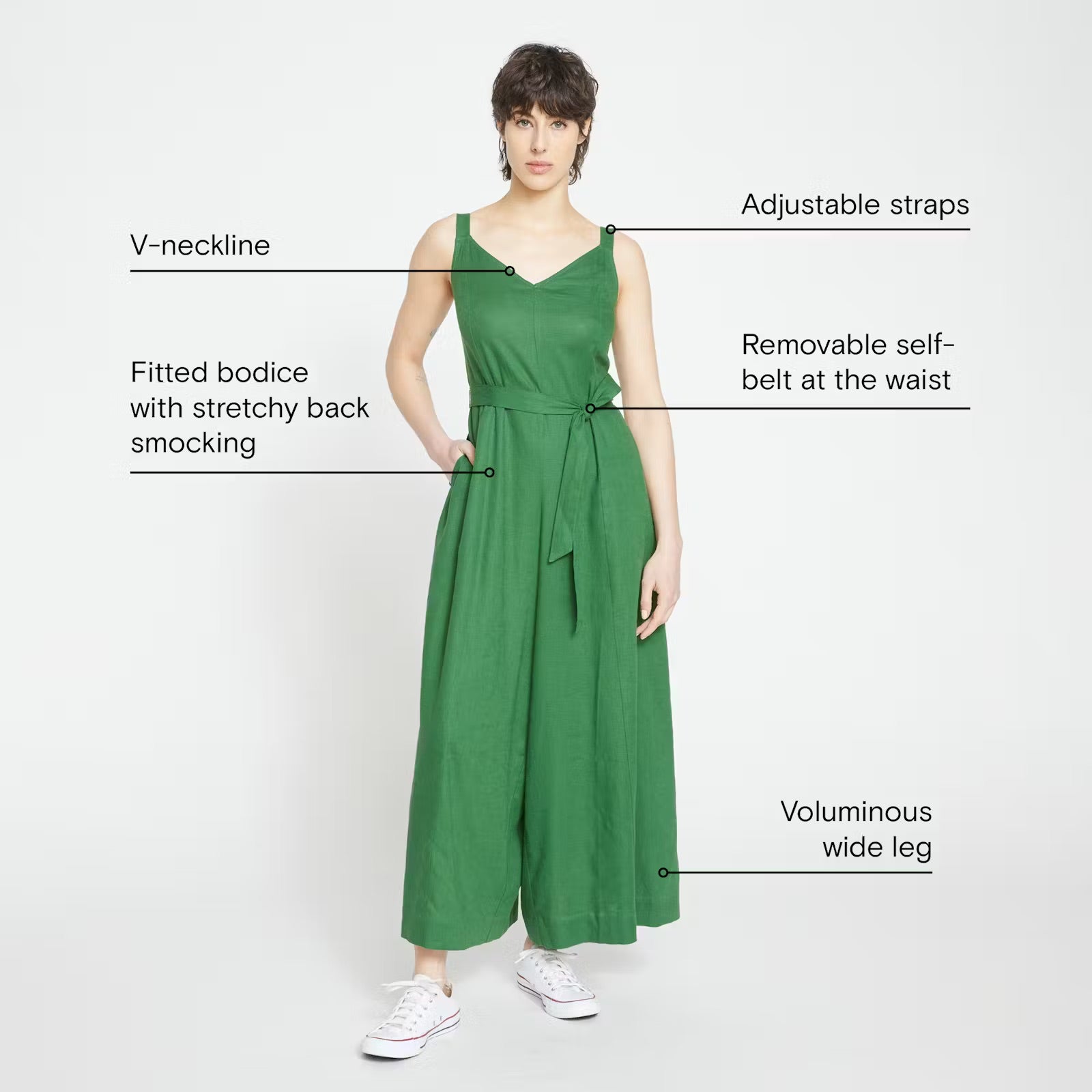 Meet the hero piece of the summer. This breathtaking jumpsuit features adjustable straps, a V-neckline, a fitted bodice with smocking at the back, a removable tie at the waist, and a voluminous wide leg. It’s made from our signature stretch linen that moves with you and feels like it’s floating effortlessly over your body. The innovative fabric has linen’s beloved textural look and feel with more freedom of movement. Effortlessly ethereal and elegant.