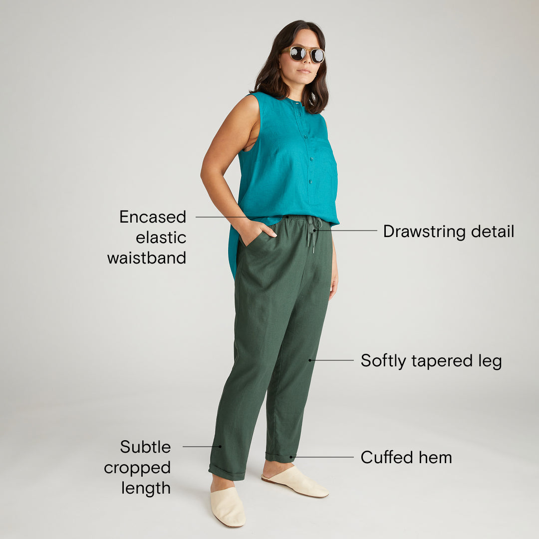 Learn MoreOur newest silhouette in our best-selling range of stretch linen pants, the Sayville Drawstring Pant features a softly tapered leg, a cuffed hem, and a subtle cropped length that nods to warmer days ahead. The waistband has an encased elastic as well as a drawstring detail—so no rolling or slipping at the waist—and is cut for an easier fit around the hip. Like holding a shell to your ear, you can't help but hear those ocean waves calling.