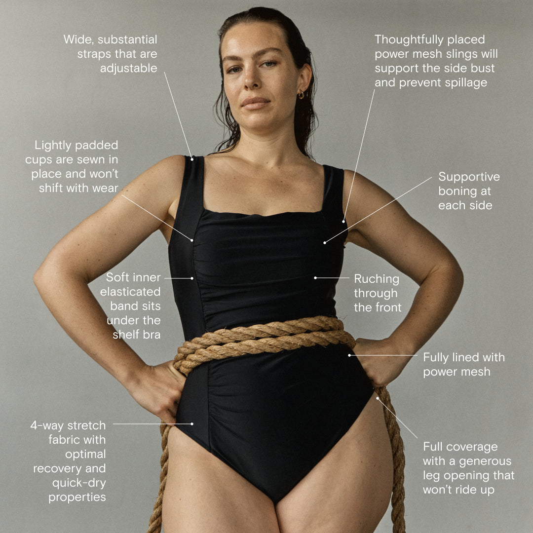 Our hands-down favorite swimsuit. Offering the support you want without any of the struggle, it’s made from a soft and flexible UPF 50 fabric with a comfortable lining. This power suit features a modern square neckline and a level of detailing that would wow Savile Row tailors.