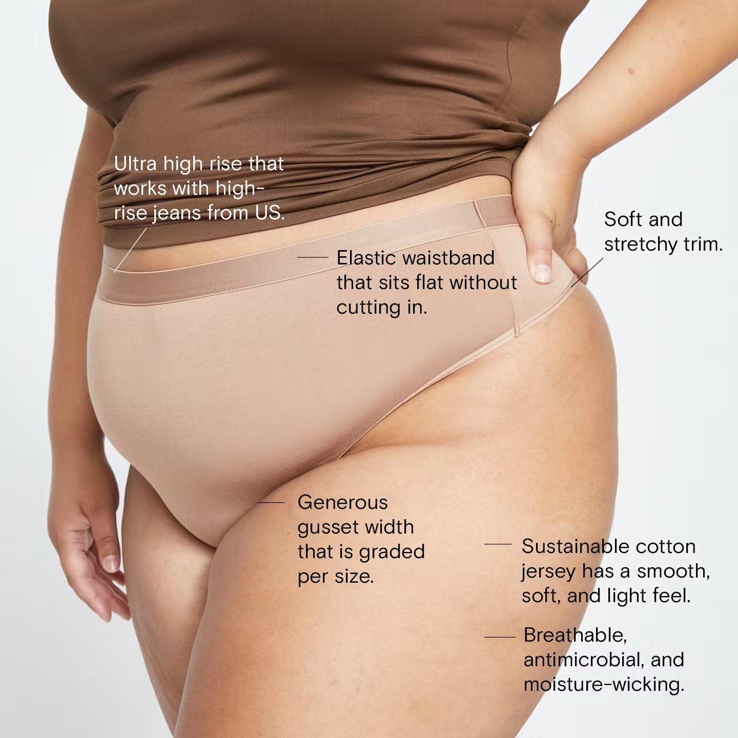 We made the unsung wardrobe heroes you've been missing. The best basics—underwear, perfected. This high-rise thong boasts maximum coverage without any visible lines on your backside. It will sit at your natural waist and under the waistband of our high-rise denim styles. With a tonal elastic band and soft trim, it's made from sustainable cotton jersey blended with modal for a smooth, light-as-air feel and second-skin fit (like it's barely there). You shouldn't have to think about underwear—leave that to US. We've thoughtfully engineered each pair to feel so comfortable you’ll forget you’ve got anything on at all.