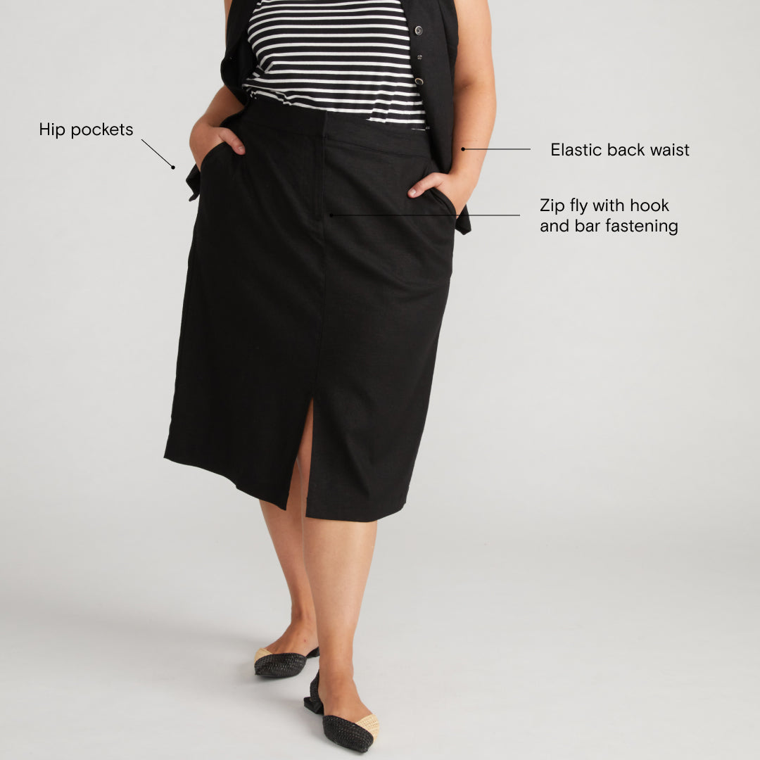Just when we thought we had already designed the perfect skirt… this linen pencil silhouette is absolutely everything. Easy and comfy in linen, sleek and polished in shape. It sits at the natural waist with a clean front and elastic waistband. The fit is simple and straight, and there’s a center front slit.
